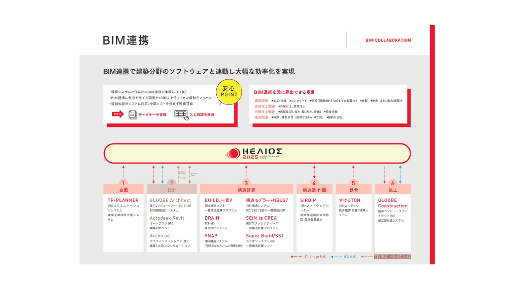 ・主要ソフトと連携:Revit、Archicad、GLOOBEなど、各種設計BIMソフトとST-BridgeやIFC形式で連携可能